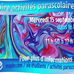Voici les activités parascolaires offertes cette année. https://mapbv.com/wp-content/uploads/2021/09/Activites-parascolaires-2021-22-web.pdf